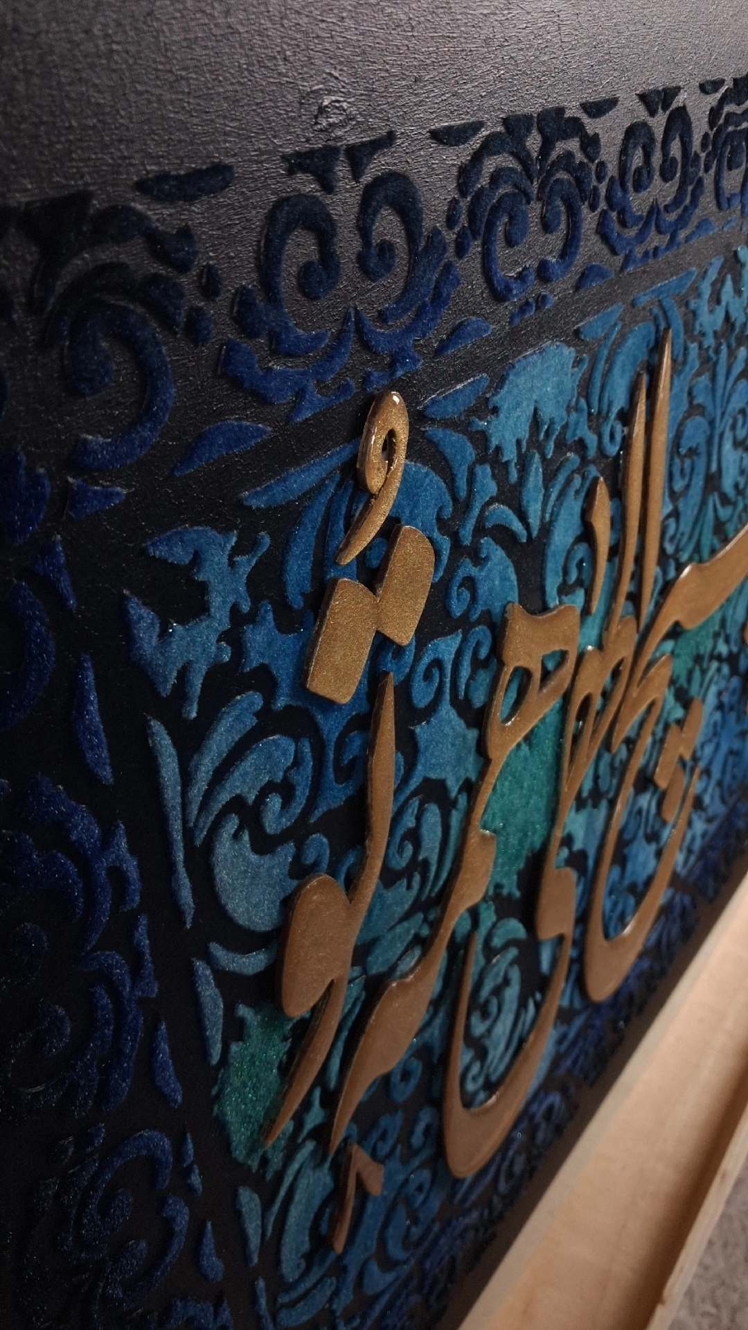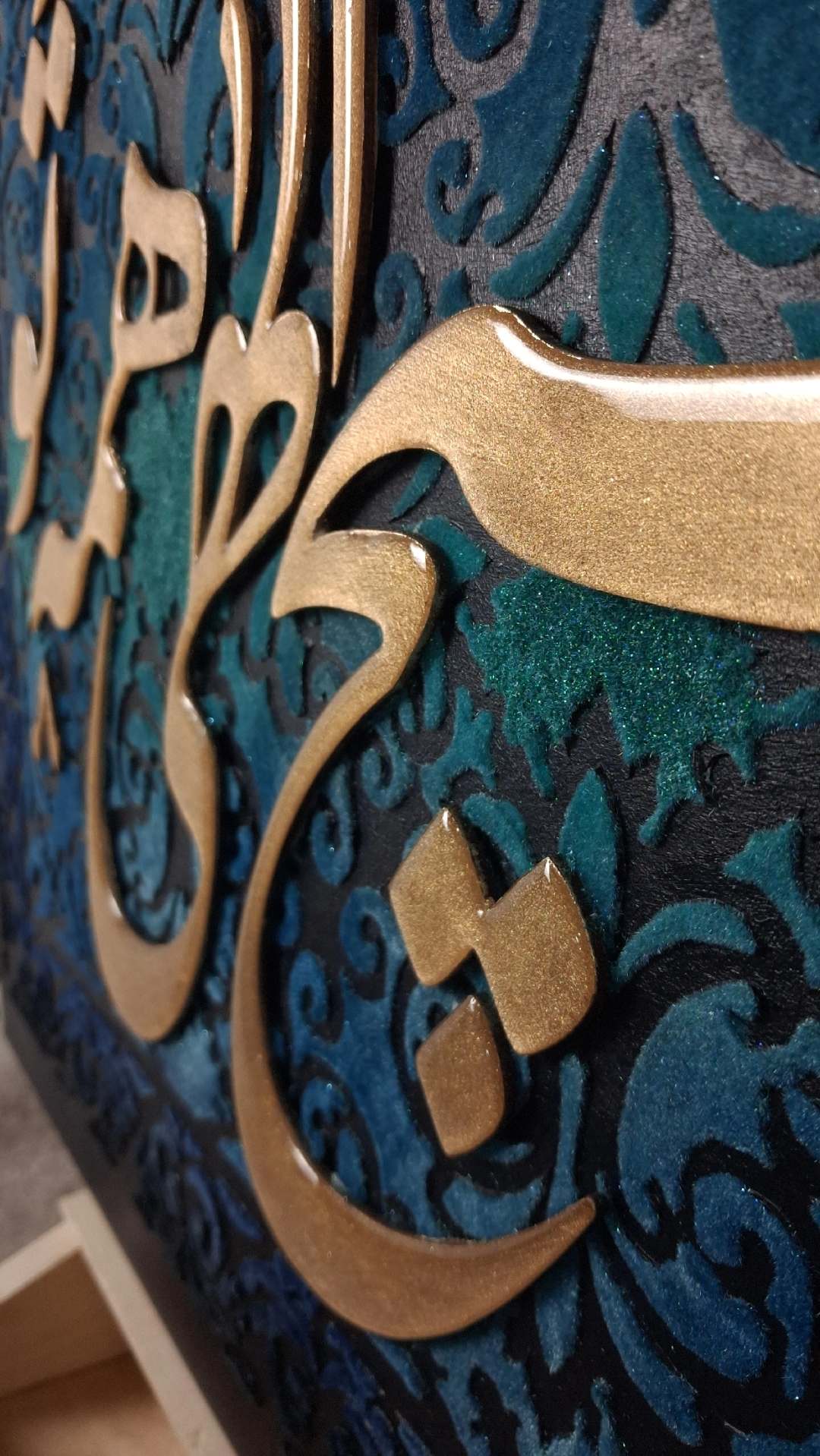 🔴:توضیحات تکمیلی محصول: حروف کالیگرافی چوبی که با رزین کاملا شفاف وبرجسته کاری شده ،طرح فرش با تکسچر برجسته و باترکیب مخمل شاین کار شده